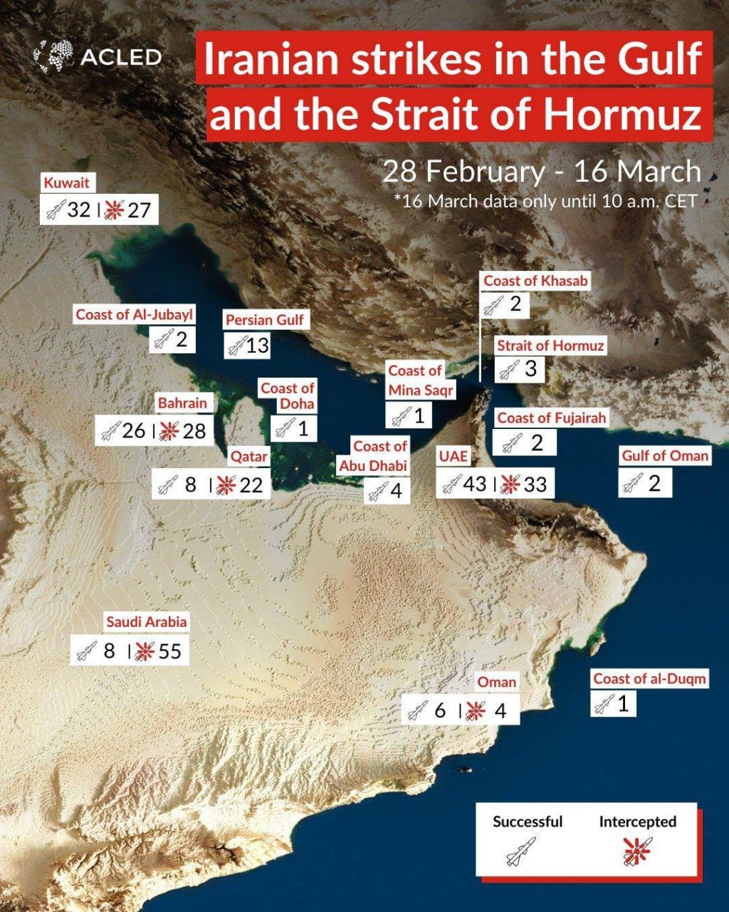 Since February 28, Iran has launched at least 717 retaliatory strikes on Gulf states, including 332 confirmed hits. Another 385 missiles were reportedly intercepted. Of those, 32 were confirmed hits on Kuwait, 43 on the UAE, six on Oman, and eight on Qatar.